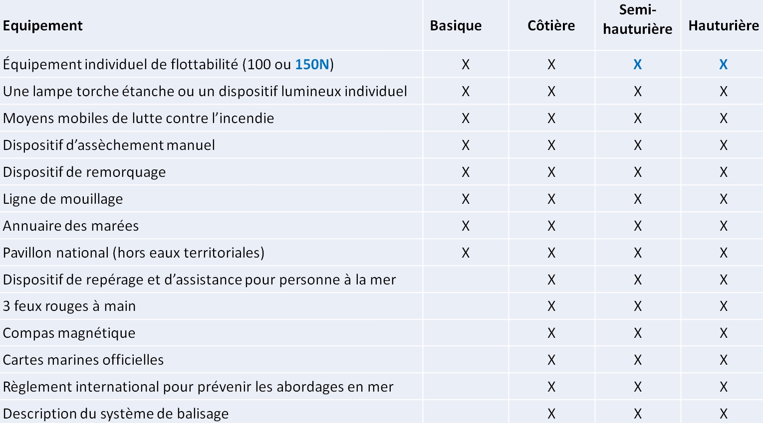 Lorsqu'ils naviguent à plus de 2 milles d’un abri, ces navires sont équipés du matériel complémentaire suivant :
